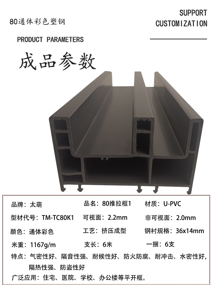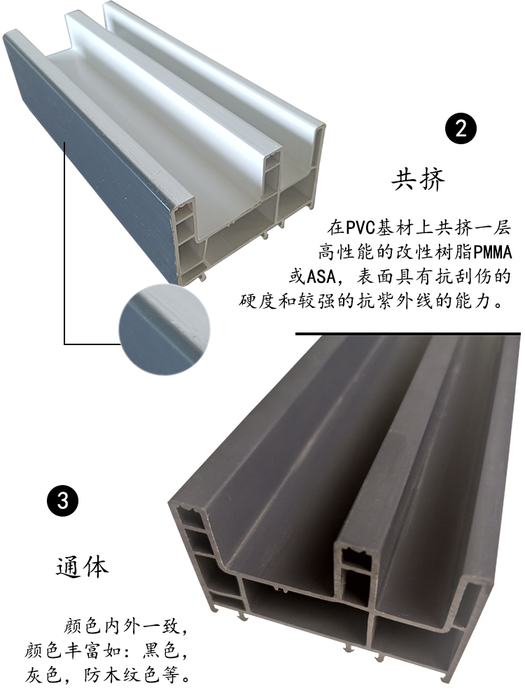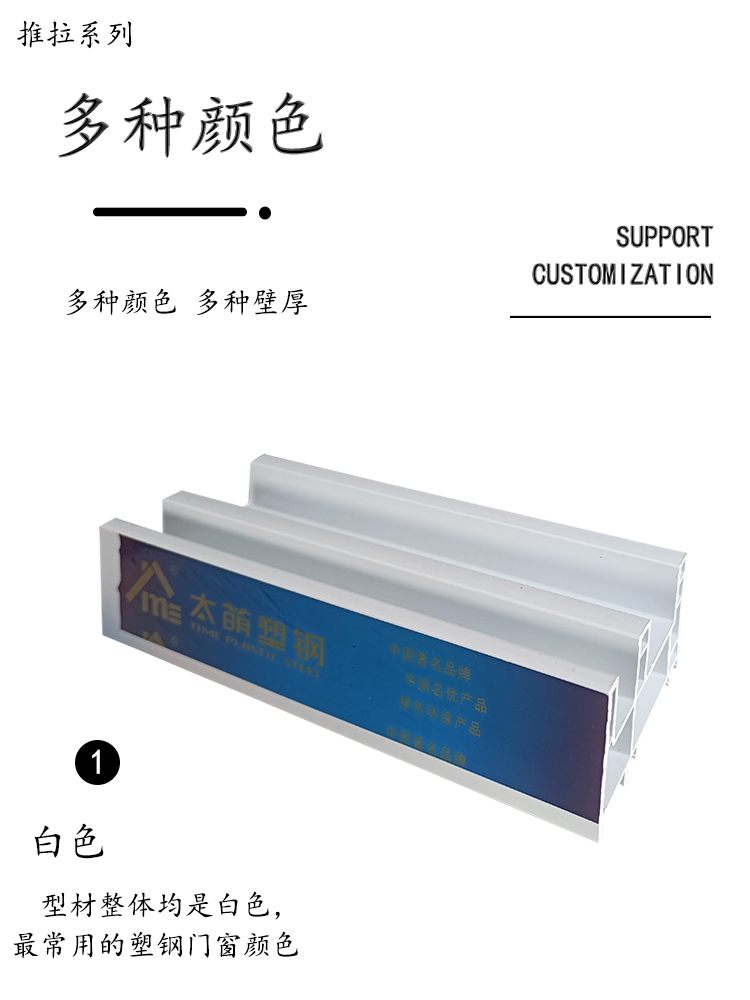 公司開發生產的塑鋼型材現有60平開和推拉系列、80推拉系列、88推拉系列,可制作固定、內外平開、推拉、上懸窗、下懸窗、百葉窗等,品種規格齊全。采用新技術、新配方,確保產品色澤一致,以及采用先進焊接平整工藝,使結構更堅固、質量更放心。本系列產品是以塑代木、代鋼、代鋁的“第四代門窗”,具有防火阻燃、耐腐蝕、隔音隔熱、外觀精美、品種新穎、不易老化、不易褪色、清洗方便等特點。主要顏色有白色、灰色、咖啡色等,可根據居室裝飾的特點確保協調一致,使你家居生活更顯示尊貴。產品適用于賓館、辦公樓、家裝門窗使用,為同類產品之精品。