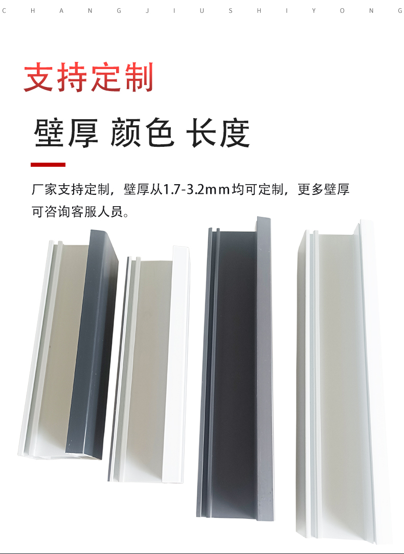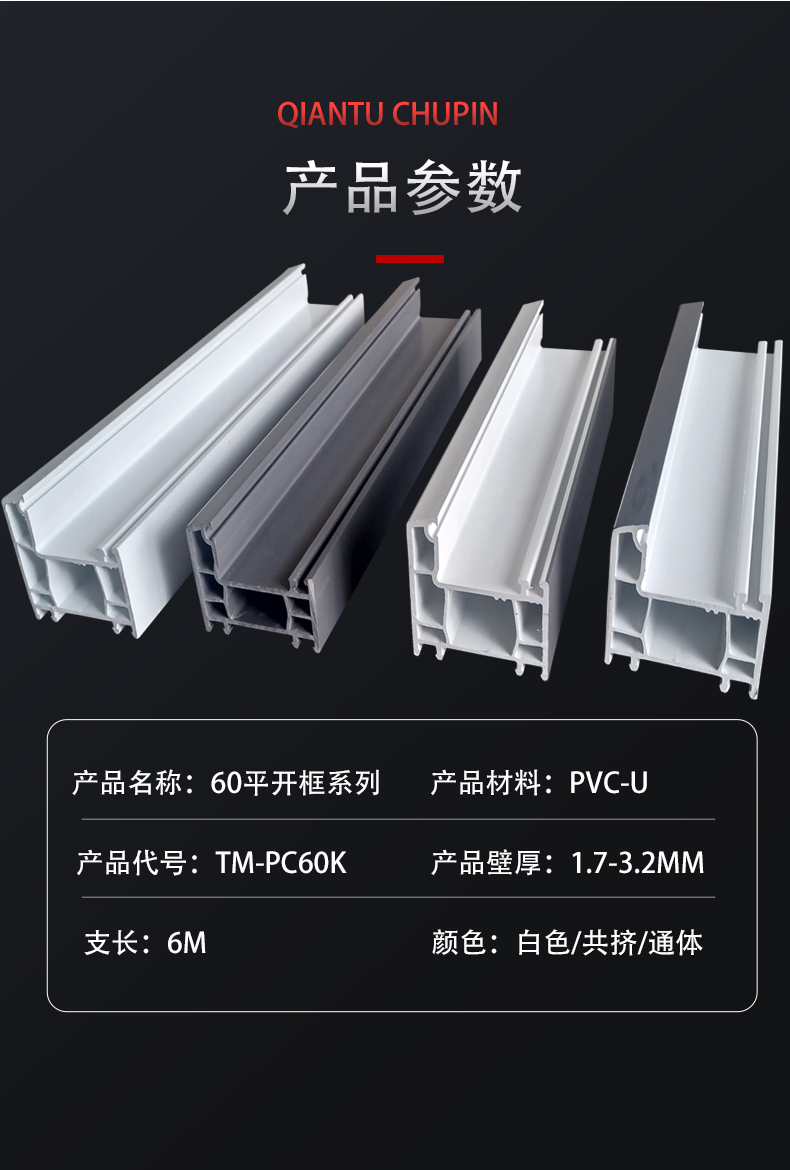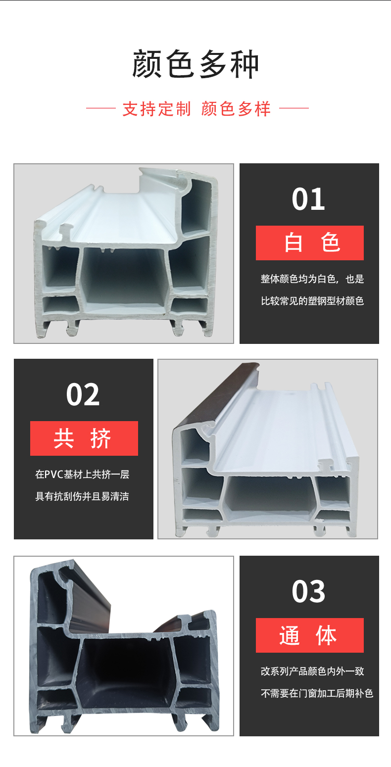 公司開發(fā)生產的塑鋼型材現有60平開和推拉系列、80推拉系列、88推拉系列,可制作固定、內外平開、推拉、上懸窗、下懸窗、百葉窗等,品種規(guī)格齊全。采用新技術、新配方,確保產品色澤一致,以及采用先進焊接平整工藝,使結構更堅固、質量更放心。本系列產品是以塑代木、代鋼、代鋁的“第四代門窗”,具有防火阻燃、耐腐蝕、隔音隔熱、外觀精美、品種新穎、不易老化、不易褪色、清洗方便等特點。主要顏色有白色、灰色、咖啡色等,可根據居室裝飾的特點確保協(xié)調一致,使你家居生活更顯示尊貴。產品適用于賓館、辦公樓、家裝門窗使用,為同類產品之精品。